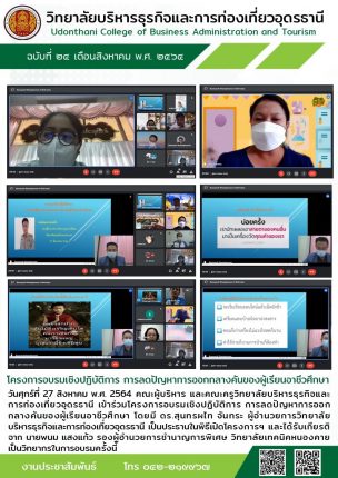 วันศุกร์ที่ 27 สิงหาคม พ.ศ. 2564 คณะผู้บริหาร และคณะครูวิทยาลัยบริหารธุรกิจและการท่องเที่ยวอุดรธานี เข้าร่วมโครงการอบรมเชิงปฏิบัติการ การลดปัญหาการออกกลางคันของผู้เรียนอาชีวศึกษา โดยมี ดร.สุนทรผไท จันทระ ผู้อำนวยการวิทยาลัยบริหารธุรกิจและการท่องเที่ยวอุดรธานี เป็นประธานในพิธีเปิดโครงการฯ และได้รับเกียรติจาก นายพนม แสงแก้ว รองผู้อำนวยการชำนาญการพิเศษ วิทยาลัยเทคนิคหนองคาย เป็นวิทยากรในการอบรมครั้งนี้.