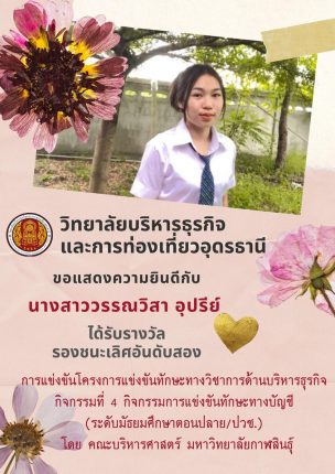 วิทยาลัยบริหารธุรกิจและการท่องเที่ยวอุดรธานี ขอแสดงความยินดีกับ วรรณวิสา อุปรีย์ นักเรียน ระดับชั้น ปวช.2 แผนกวิชาการบัญชี ได้รับรางวัลรองชนะเลิศอันดับสอง